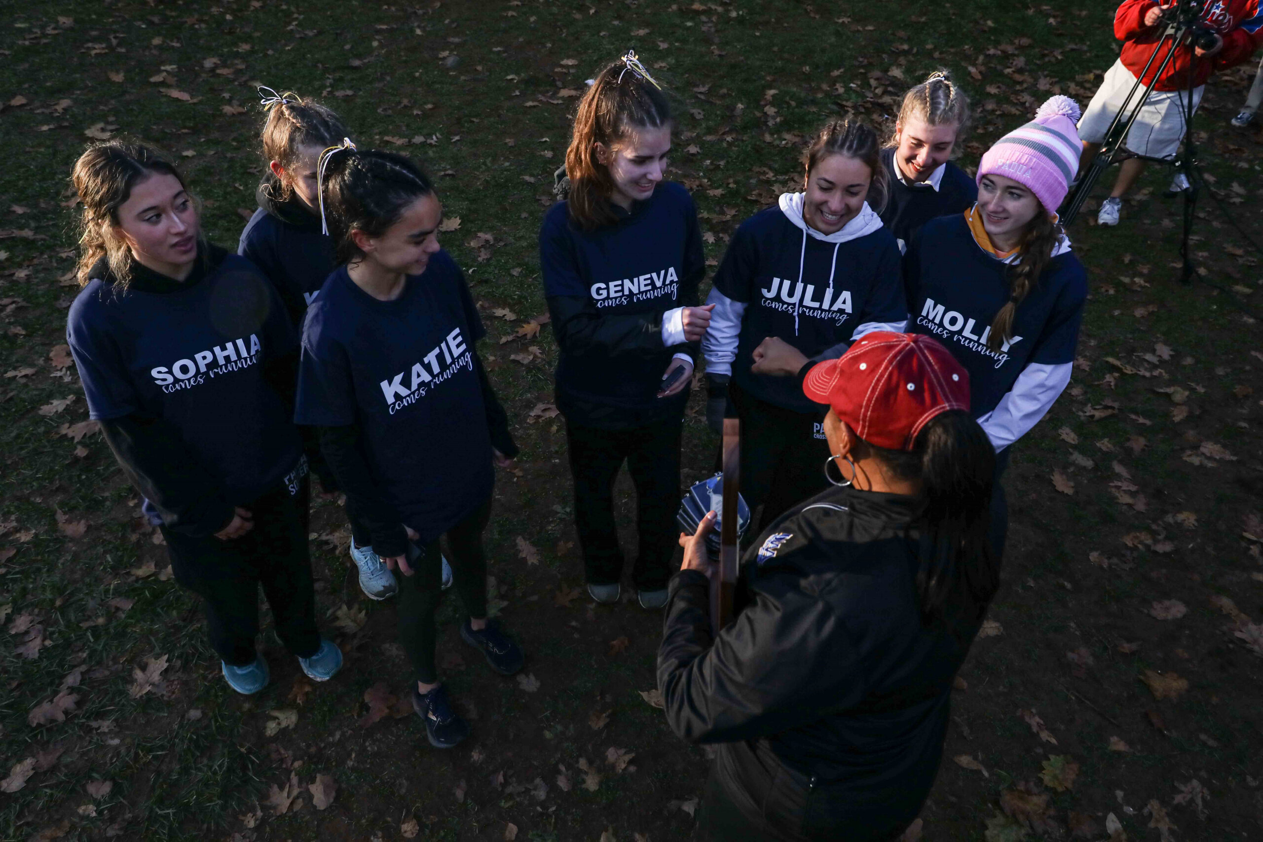 DIAA Executive Director Donna Polk presents Padua Academy with metals and trophy after at the DIAA 2021 Cross Country State Championships. Photo By Saquan Stimpson