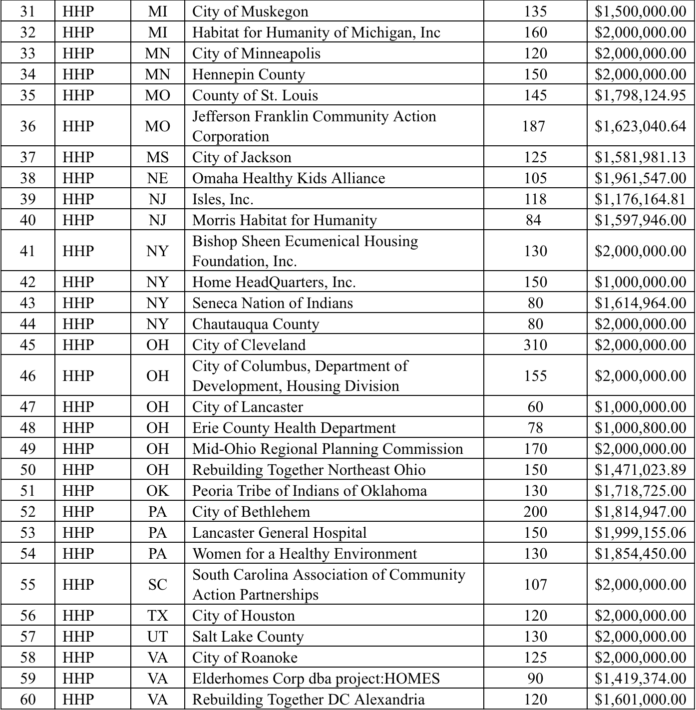 HUD is providing these grants through its Healthy Homes Production Grant Program which will help grantees identify health and safety hazards in low-income families’ homes. The grants will protect children and families with incomes at or below eighty percent of the area median income level by targeting significant lead and health hazards in over 7,400 low-income homes for which other resources are not available.