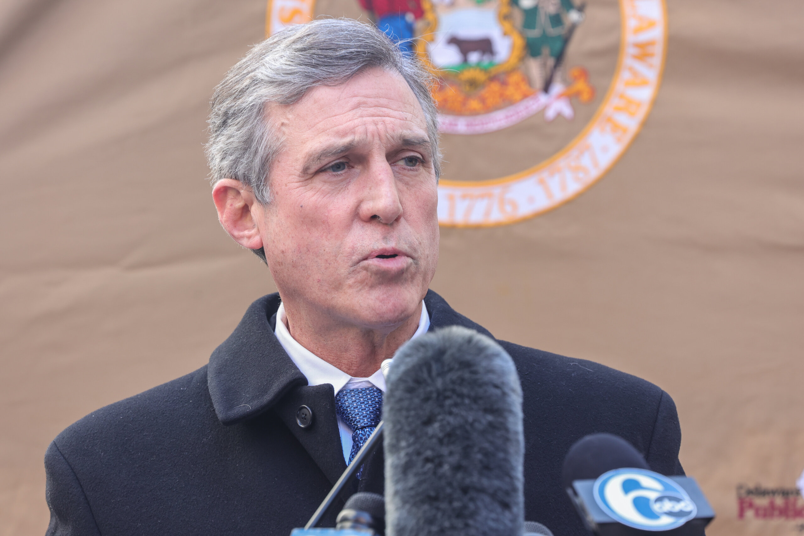 The Honorable John C. Carney Jr, Governor, State of Delaware gives remarks to the media during a Mary Ann Shadd Cary maker ceremony Wednesday, February. 02, 2022, at Spencer Plaza in Wilmington, Delaware. Mandatory Credit: Saquan Stimpson