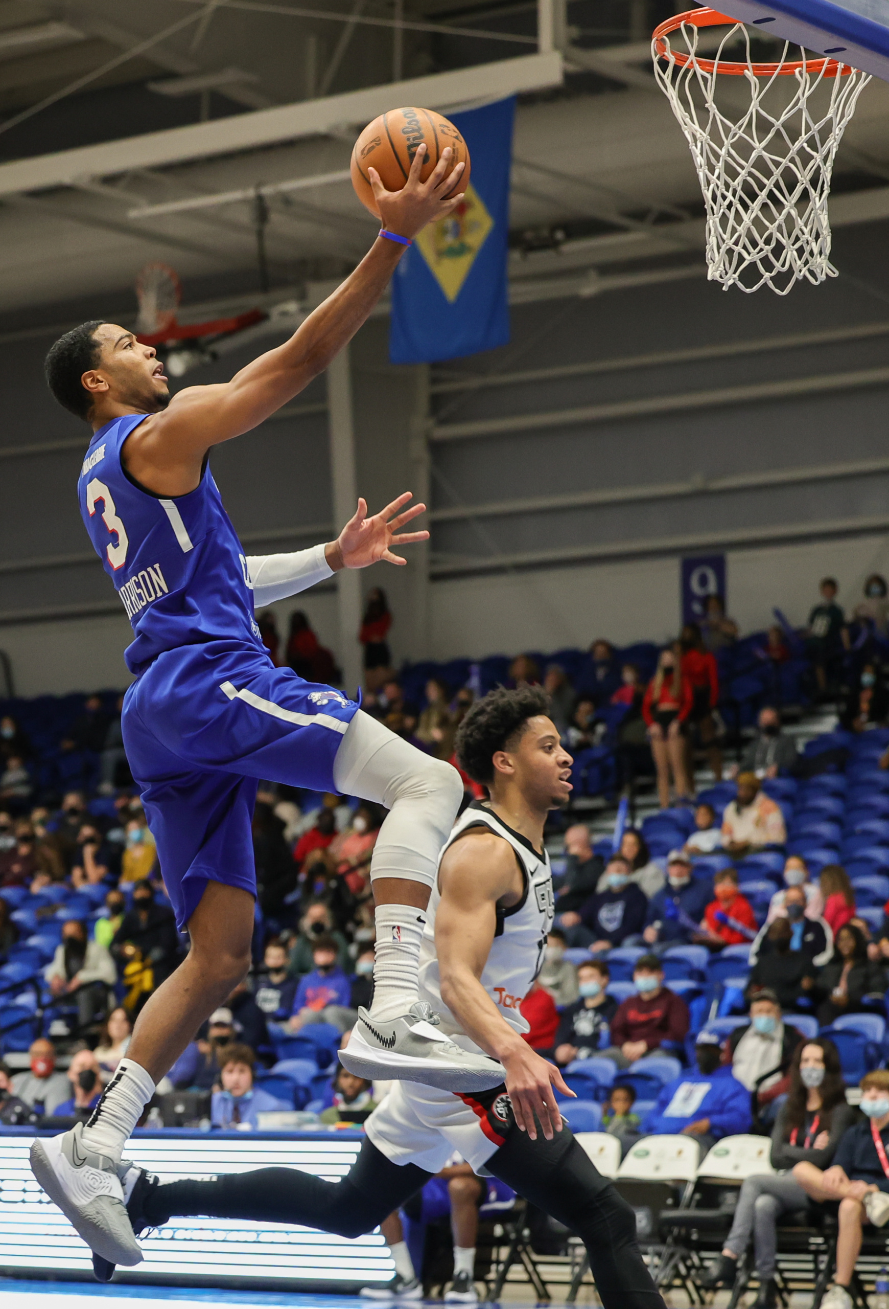 Delaware Bluecoats Guard SHAQUILLE HARRISON (3) drives to the basket as Raptors 905 Guard OBADIAH NOEL (17) defends during an NBA G-league regular season basketball game between the Delaware Blue Coats and the Raptors 905 Saturday, Feb. 12, 2022, at the Chase Fieldhouse in Wilmington, DE. Photo by Saquan Stimpson