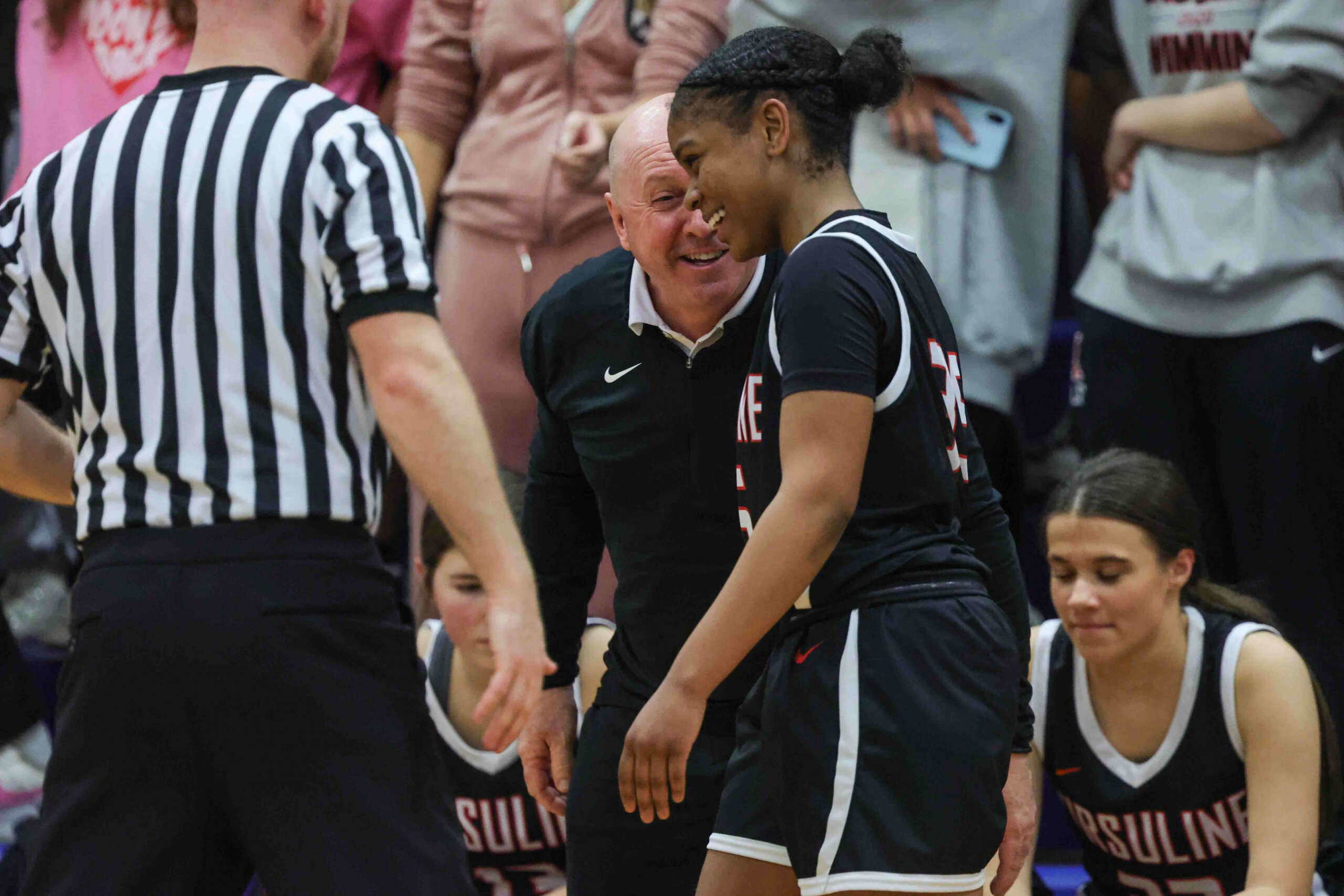Ursuline Academy head coach John Noonan and Ursuline Academy Chamira Marshall Brothers (35) celebrate near the bench during a DIAA quarterfinal girls basketball game between No. 3 Charter School of Wilmington and No. 6 Ursuline Academy Monday, Mar 7, 2022; at the Charter School of Wilmington in Wilmington, DE. Photo By Saquan Stimpson
