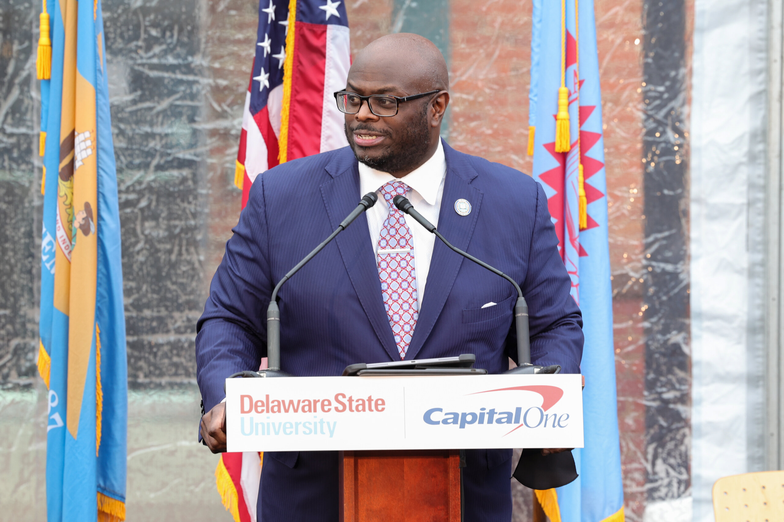 Dr. Tony Allen President of Delaware State University delivers remarks during Capital One and the Delaware State University ribbon-cutting ceremony to make their New Historic Downtown satellite facility Friday, February 25, 2022, in Wilmington, Delaware. Mandatory Credit: Saquan Stimpson