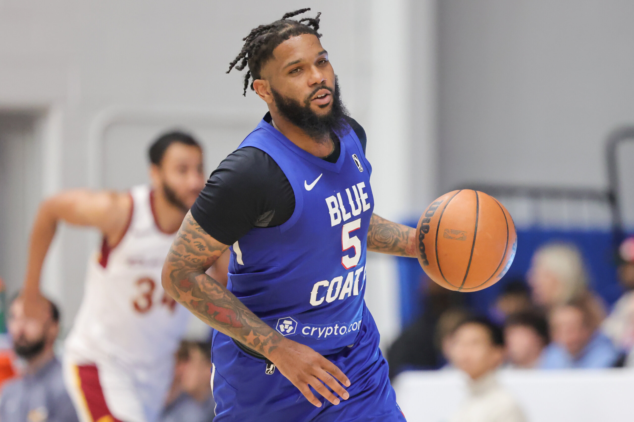 Delaware Blue Coats guard Myles Powell (5) dribbles the ball in the course of Star Wars night during an NBA G-league regular season basketball game between the Delaware Blue Coats and the Cleveland Charge Friday, Mar. 25, 2022, at the Chase Fieldhouse in Wilmington, DE
