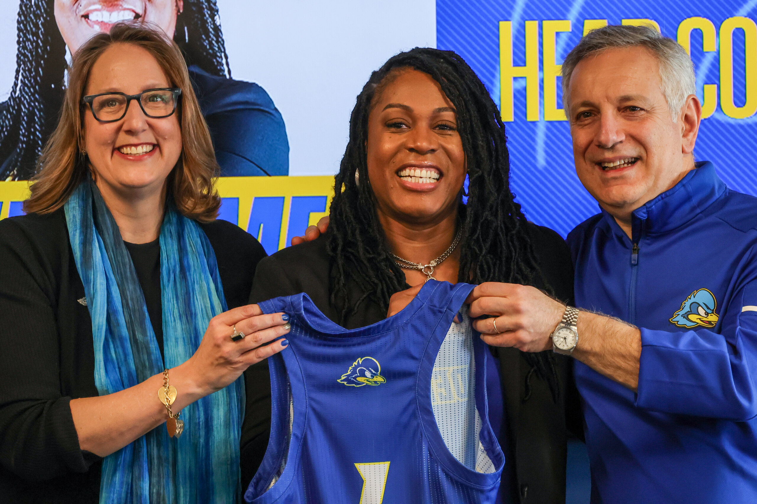 FROM LEFT: Director of Athletics CHRISSI RAWAK, Delaware New Women’s Basketball Head Coach SARAH JENKINS and University President DENNIS ASSANIS pose for a photo during a press conference announcing her hiring Tuesday, April 05, 2022; at The Bob Carpenter Sports Convocation Center in Newark, DE. Photo By Saquan Stimpson