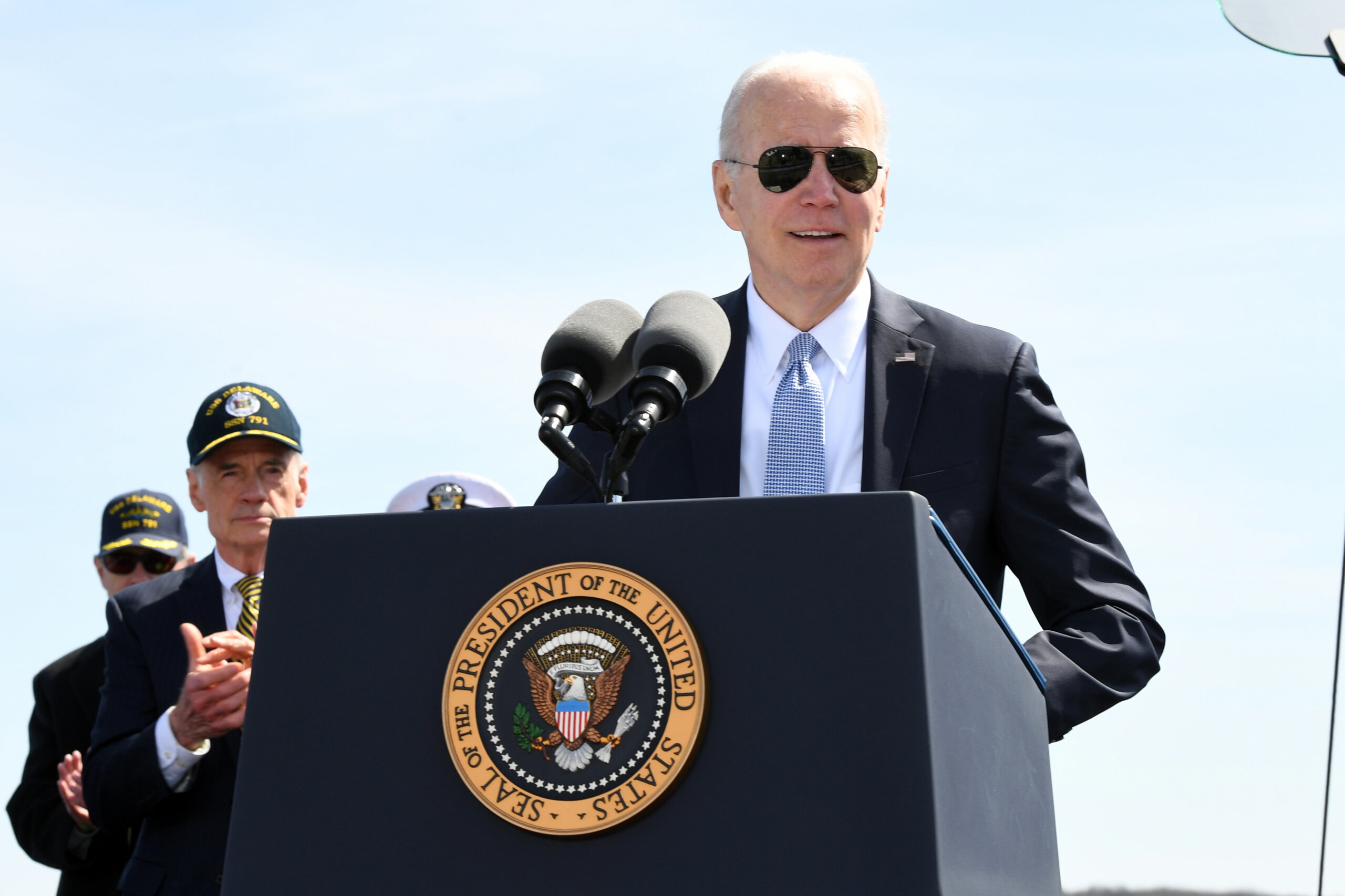 220402-N-GR655-0586 WILMINGTON, Delaware (April 2, 2022) – President of the United States Joe Biden delivers remarks during a commissioning commemoration ceremony for the Virginia-class submarine USS Delaware (SSN 791) in Wilmington, Delaware April 2, 2022. The initial commissioning took place administratively in April 2020 due to COVID restrictions at the time and is the first submarine to be commissioned while submerged. Delaware, the seventh U.S Navy ship and first submarine named after the first U.S. state of Delaware is a flexible, multi-mission platform designed to carry out the seven core competencies of the submarine force: anti-submarine warfare; anti-surface warfare; delivery of special operations forces; strike warfare; irregular warfare; intelligence, surveillance and reconnaissance; and mine warfare. (U.S. Navy photo by Chief Petty Officer Joshua Karsten)