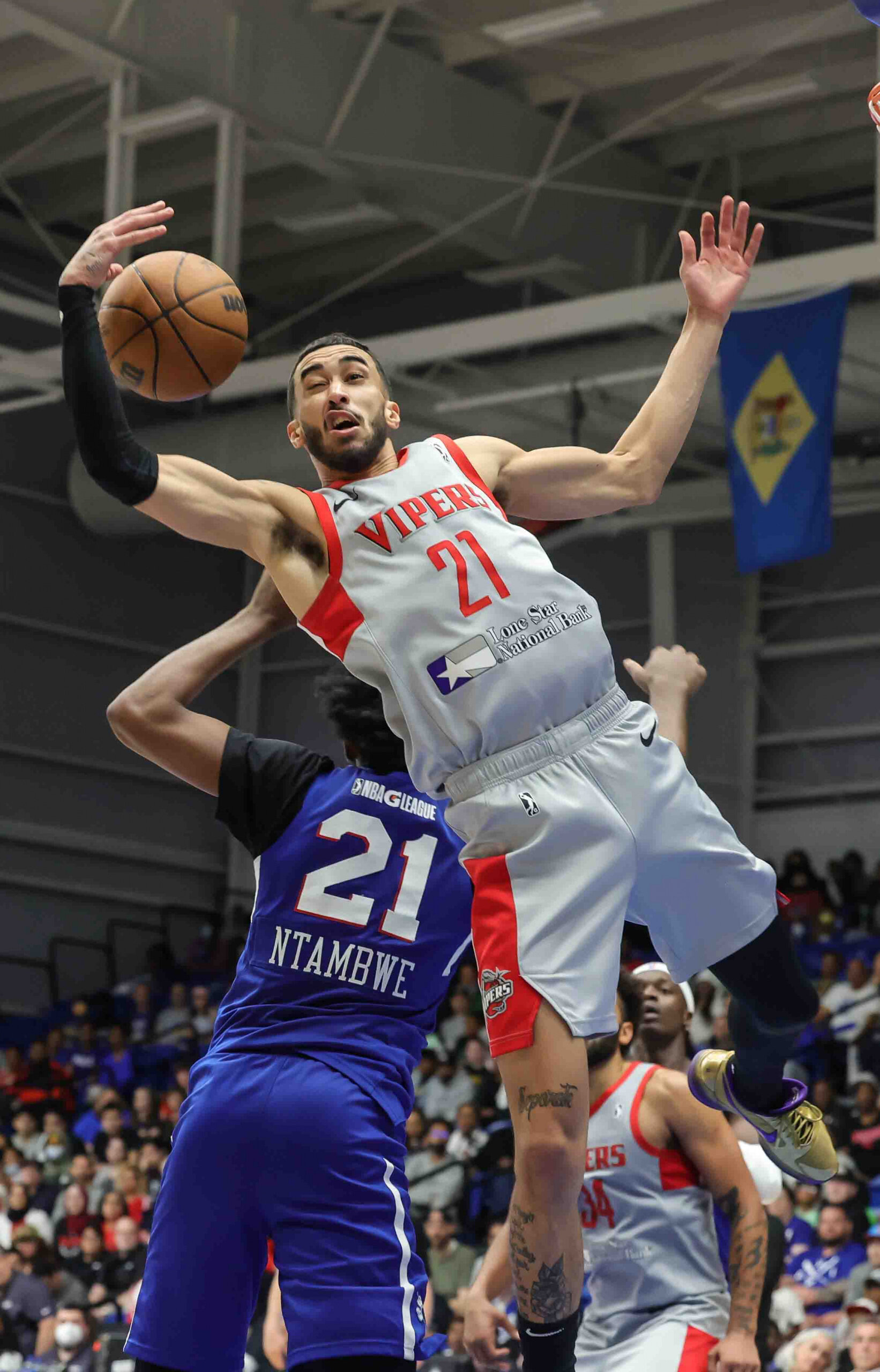 Rio Grande Valley Vipers guard TREVELIN QUEEN (21) attempts to rebound the ball during game two of the NBA G-league Finals between the Delaware Blue Coats and the Rio Grande Valley Vipers Thursday, Apr. 14, 2022; at the Chase Fieldhouse in Wilmington, DE. Photo by Saquan Stimpson