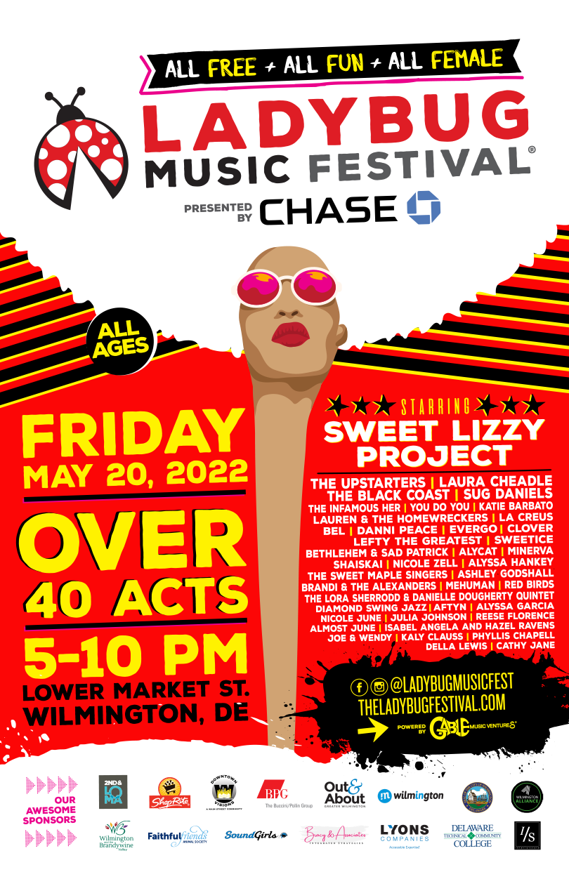 Businesses on the 200 block of Market are throwing open their doors to host a variety of talent at this year’s event. Artists hail not only from Wilmington, Philadelphia, and the surrounding area, but as far as New York City, Nashville, Tennessee, and Portland, Oregon. This year’s headliner is the fantastic Sweet Lizzy Project. Founded in Cuba in the mid-2010s, the band defected to the United States in 2017 where they’ve been recording and touring out of their home base in Nashville. Their anthemic modern rock and high-energy performance will be the perfect way to cap off an amazing day of music. Other artists on the bill include The Upstarters, The Infamous HER, Laura Cheadle, Sug Daniels, and many, many more. Founder Gayle Dillman is excited about the diversity in this year’s lineup. “We try to hit on as many genres of music as we can. And I think we pretty much touch on everything,” said Dillman. “In addition to Rock, we have Alternative Indie groups, some Hip-Hop, Folk & Country as well as Singer-Songwriters and Jazz. A little bit of everything” The Ladybug Music Festival takes place May 20, 2022, on the 200 & 300 blocks of Market Street, with an additional stage at Humble Park on 4th & Shipley. Music begins at 5:00 pm and is made possible with the support of Chase Bank, 2nd and LOMA, ShopRite Kenny Family Stores, Downtown Visions, The Office of Economic Development, The City of Wilmington, BPG, Greater Wilmington Visitors Bureau, and Wilmington Alliance. Other sponsors include Out & About, InWilmington, WDEL, Faithful Friends, Bracy & Associates, Lyons Insurance, WhyFly, The Wilmington Whiskey Club, Soundgirls, and Del Tech Community College. FESTIVAL DETAILS:WHEN: Friday, May 20, 2022WHERE: 200 & 300 Blocks of Market St, Wilmington, DETIME: 5:00pm – 10:00pmTICKET INFO: Admission is FREE.