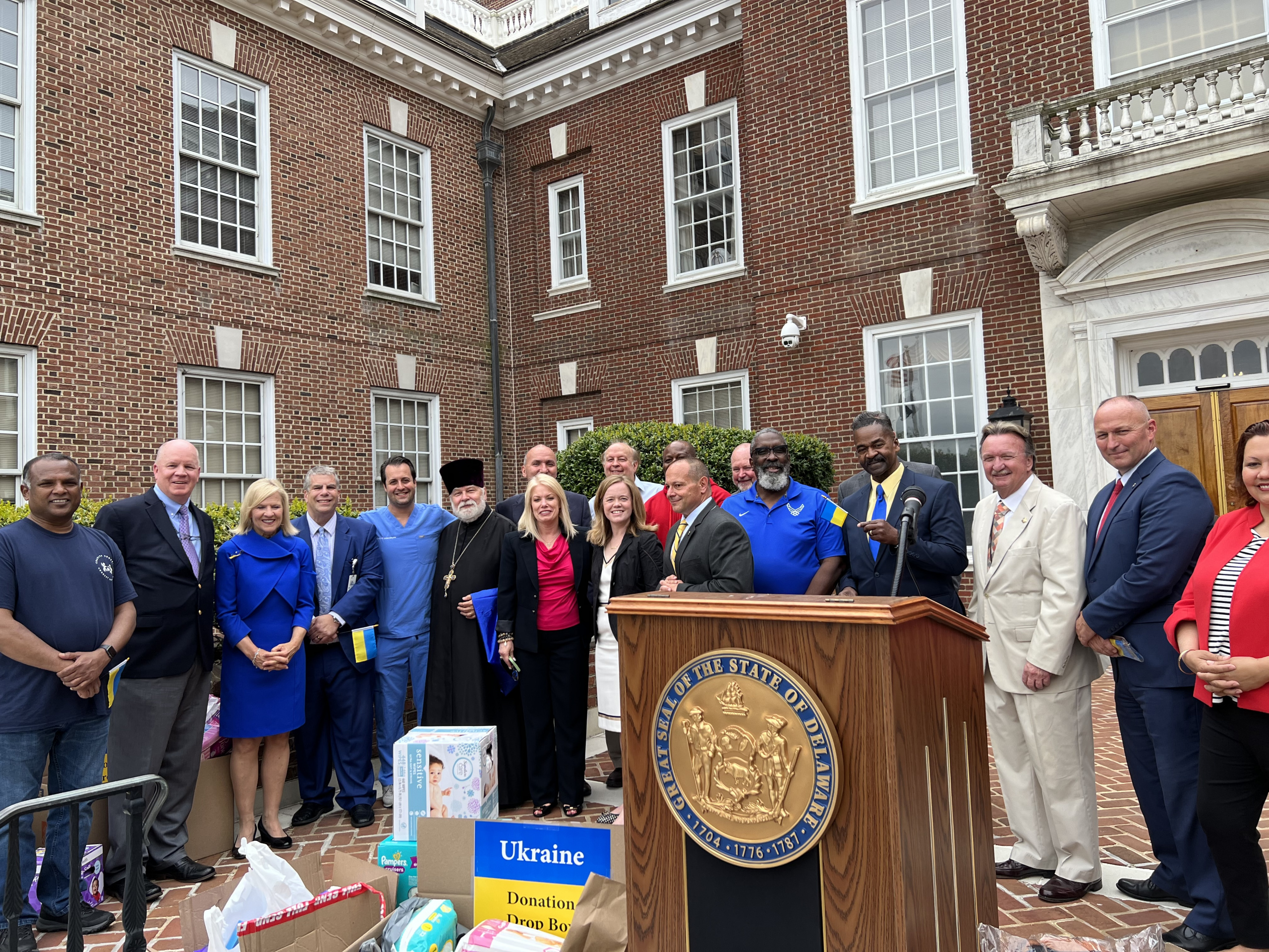 Dover, Del. – Lt. Governor Bethany Hall-Long was joined by Members of the General Assembly, Donate Delaware, PAM Health, Charity Crossing, and the Delaware Council on Faith-Based Leadership on May 11th to support the brave people of Ukraine.